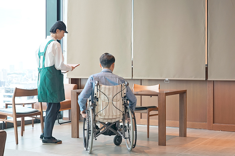 飲食店で「車椅子のまま着席したい」との申し出があり、机に備え付けの椅子を片付け、車椅子のまま着席可能なスペースを確保した。