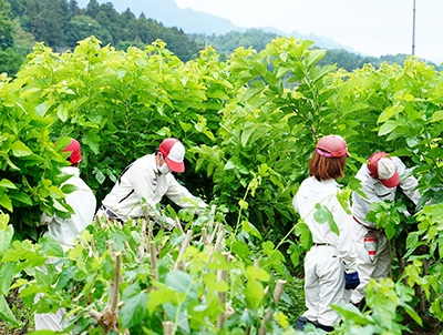 桑園で桑を収穫する様子