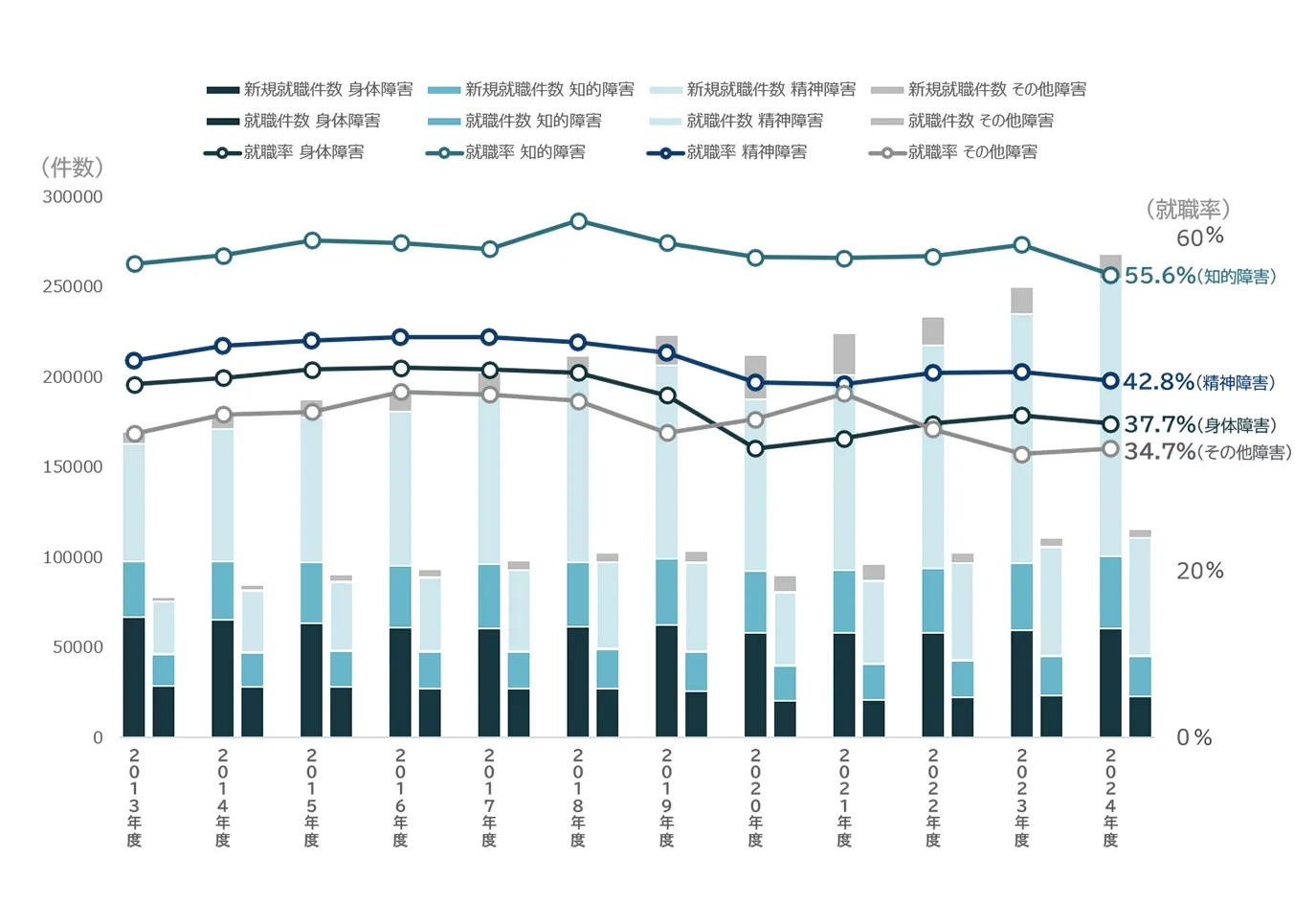 障害者の新規求職申込件数と就職件数は、コロナ禍を除いて増加傾向にあります。特に精神障害者の増加が目立ち、2024年度は前年と比べて11.1%も増加しています。この背景には、法定雇用率の引き上げによって企業の障害者採用が増えたことや、短時間勤務やテレワークなど多様なはたらき方が広がったことが考えられます。